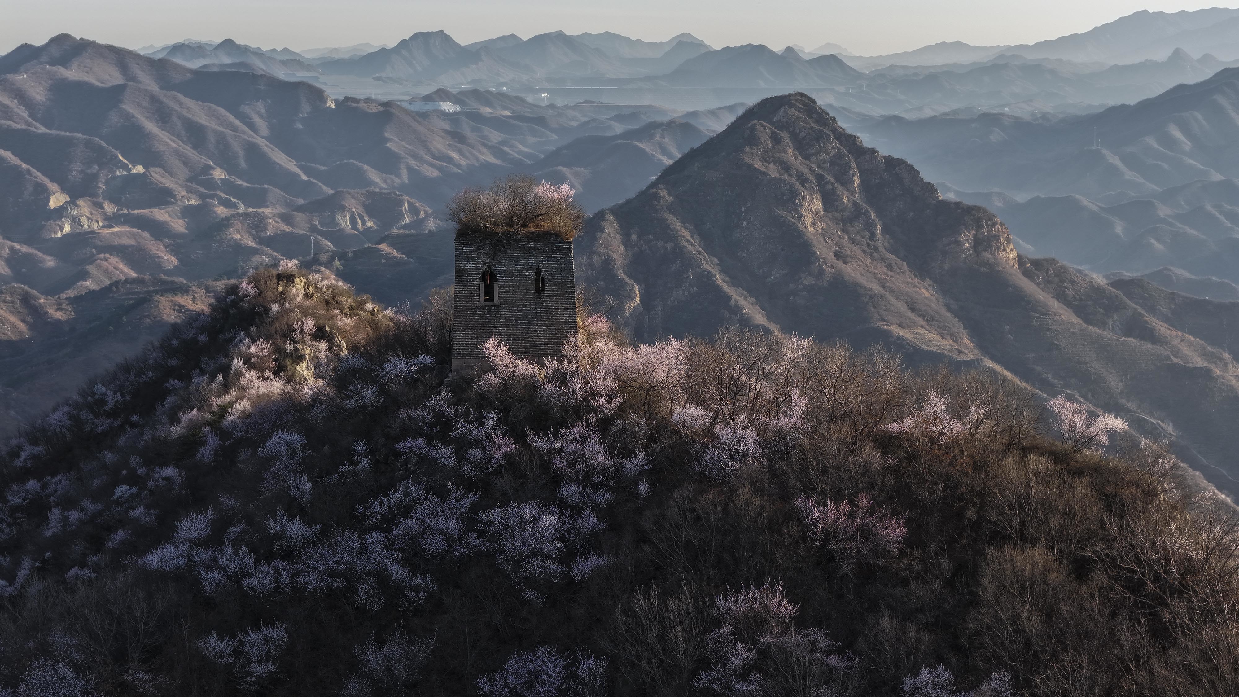 近日,随着气温回暖,河北省唐山市迁西县的长城周边山花烂漫,美如画卷。